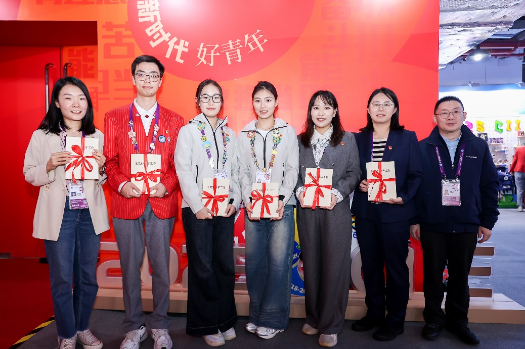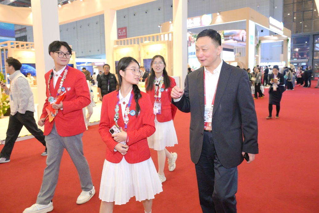 11月7日下午,校党委书记林在勇、团市委挂职副书记唐志宇,校党委副书记、副校长朱惠军在进博会现场向服务一线的师大“小叶子”们致以亲切慰问。
