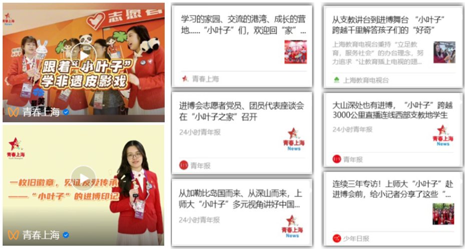 在本届进博会会展期间,多名上海师大“小叶子”的优秀事迹被光明日报、新民晚报、上海教育电视台、青春上海、青年报等多家媒体报道,诠释了新时代青年勇担使命的青春担当。