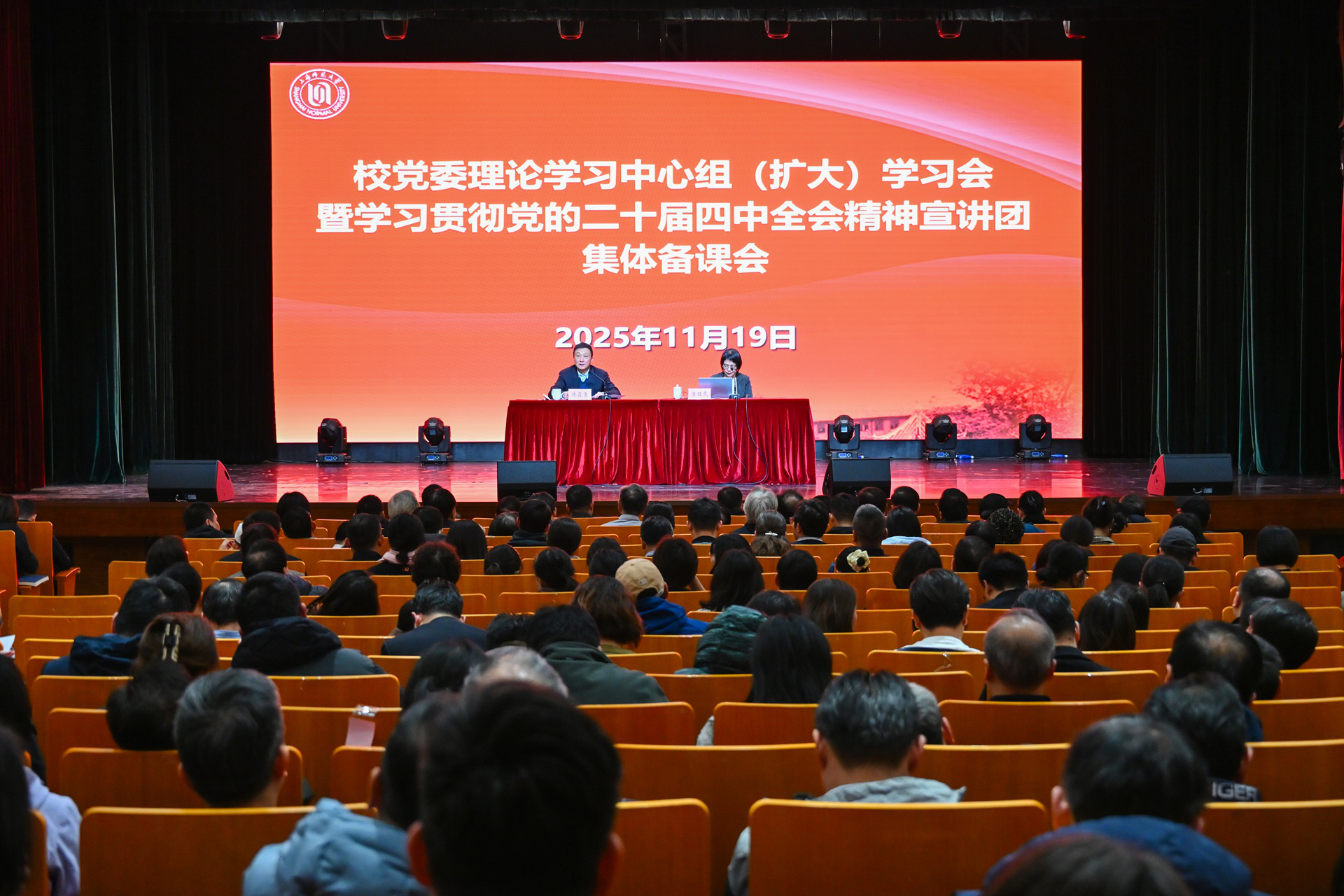 11月19日下午,学校在徐汇校区音乐厅举行校党委理论学习中心组(扩大)学习会暨学习贯彻党的二十届四中全会精神宣讲团集体备课会。校党委理论学习中心组成员、副处级以上干部、学校学习贯彻党的二十届四中全会精神宣讲团成员、马克思主义学院教师、辅导员、宣传员及部分学院师生代表等近600人参加学习。校党委书记林在勇作宣讲工作动员并主持学习会。