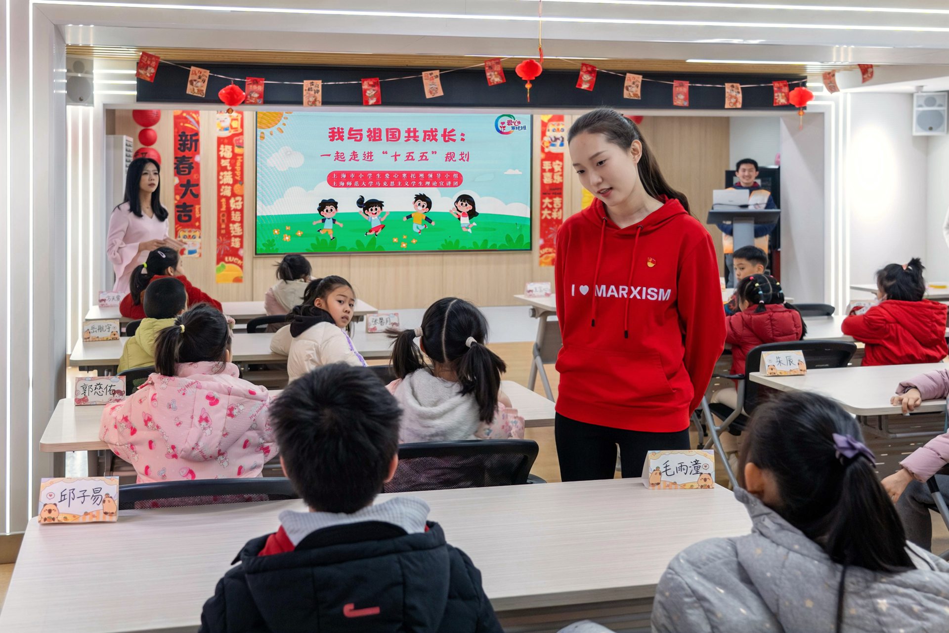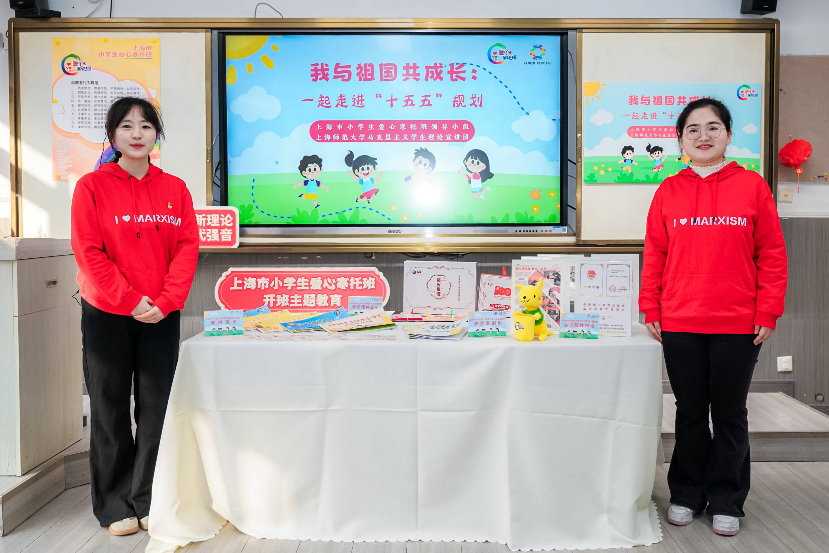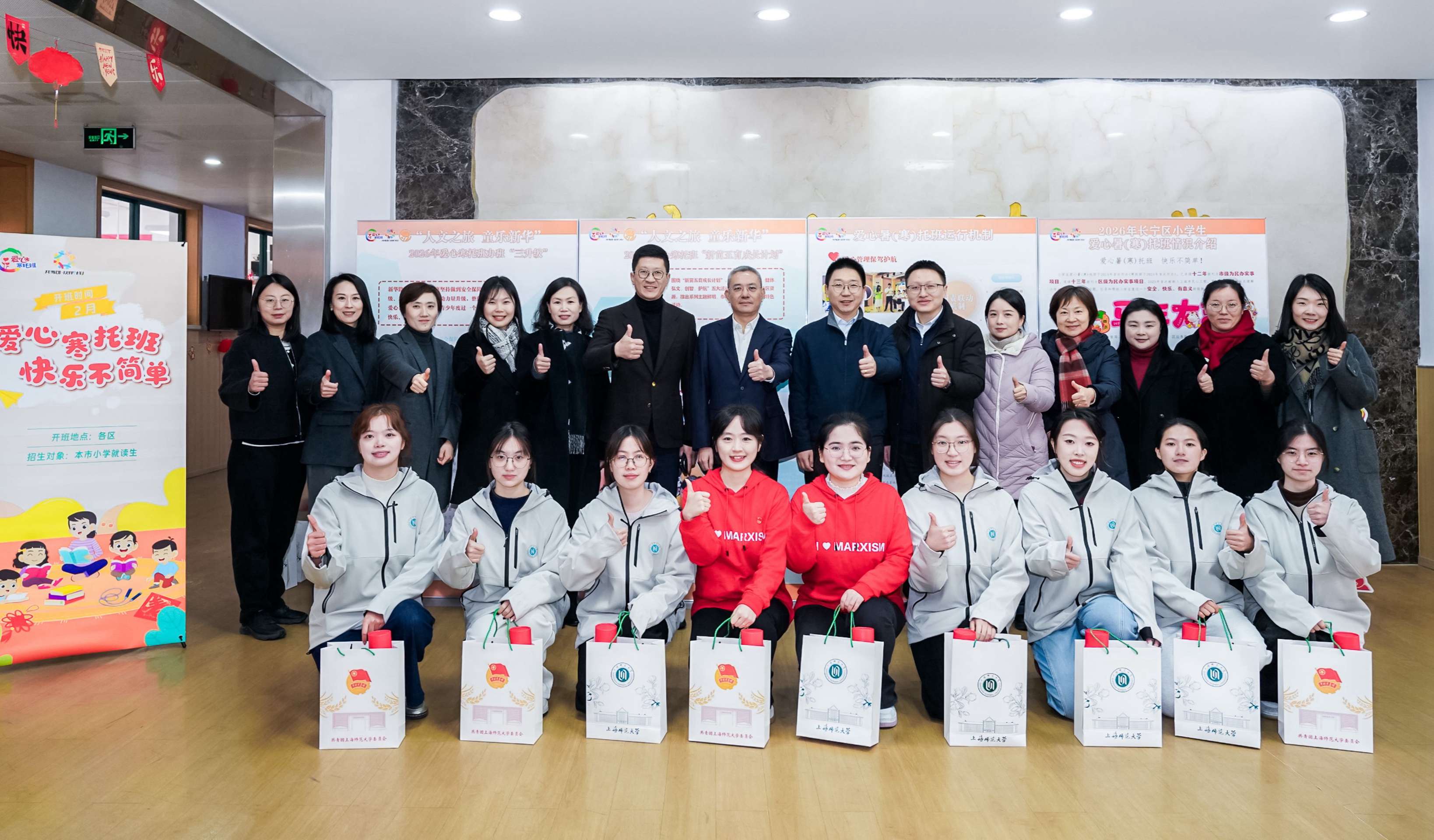 2月2日上海市小学生爱心寒托班开班首日,团市委副书记,市团校党委书记、校长王江,上海师范大学党委副书记、副校长赵扬,市教委德育处一级调研员江伟鸣,团市委学校工作部部长葛银锋,团市委学校工作部副部长周薇,团长宁区委书记郭文瑞,新华路街道党工委书记郝鹏、马克思主义学院党委书记刘凤等一行走访长宁区新华路街道爱心寒托班,参与开班仪式并观摩由校团委联合马克思主义学院共同开发的上海市小学生爱心寒托班开班主题教育《我与祖国共成长:一起走进“十五五”规划》。