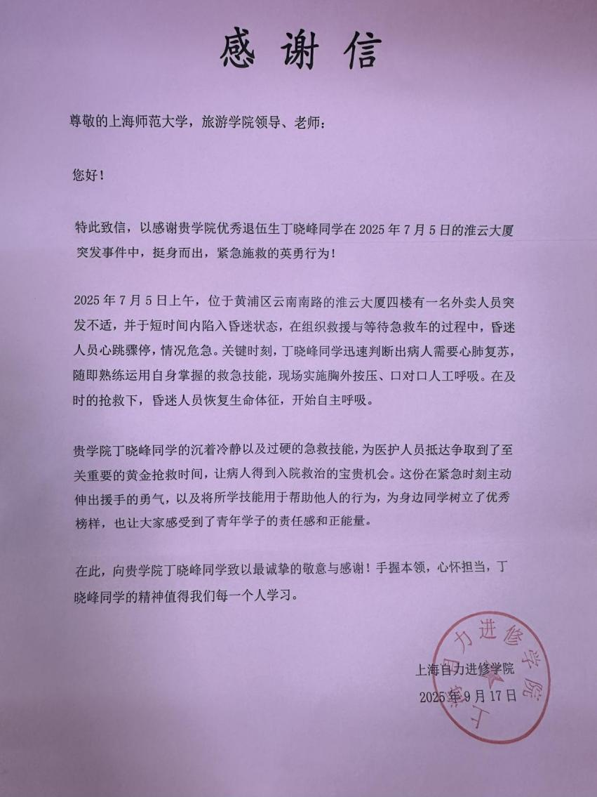 7月5日上午,黄浦区云南南路淮云大厦四楼,一名外卖员突然倒地、面色苍白、心跳骤停。正在上海自力进修学院实习值岗的丁晓峰冲到现场,迅速判断患者“无呼吸、无脉搏”,随即果断跪地实施心肺复苏。经过持续、规范的心肺复苏操作,昏迷人员逐渐恢复生命体征,开始自主呼吸!丁晓峰沉着冷静,以专业的急救技能为医护人员争取了至关重要的黄金抢救时间。