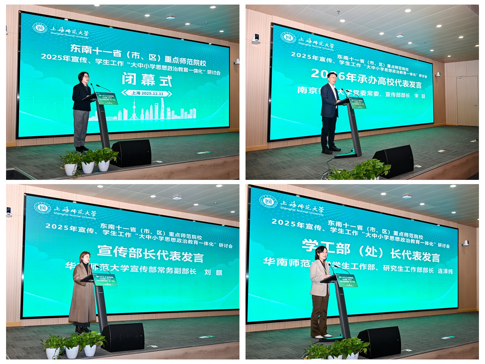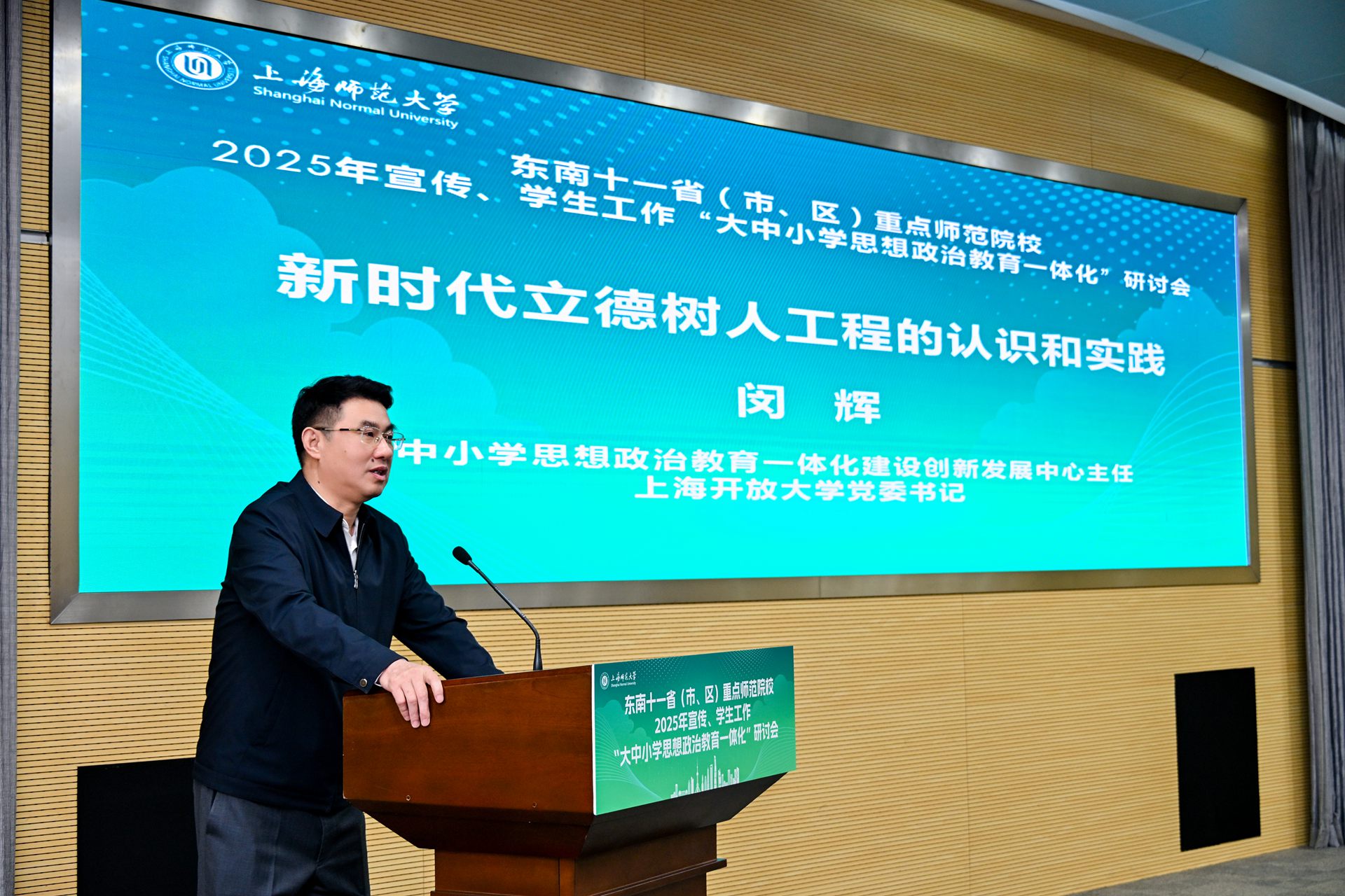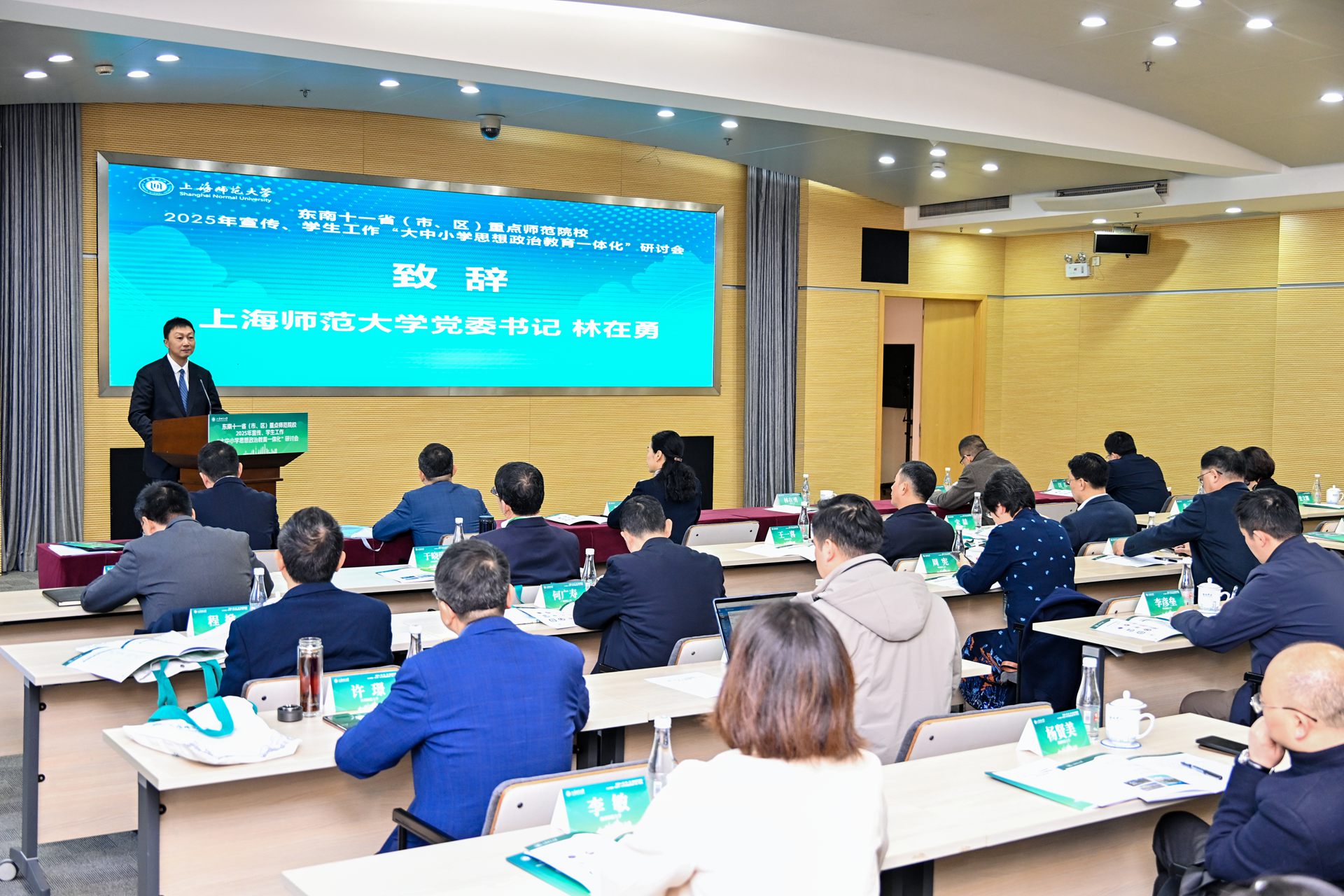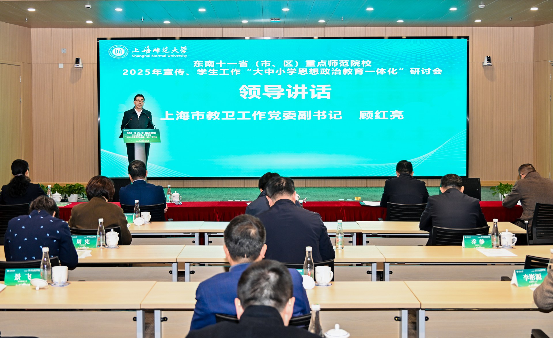 为深化大中小学思想政治教育一体化建设,加快推进新时代立德树人工程,12月10日至12日,学校举办东南十一省(市、区)重点师范院校2025年宣传、学生工作“大中小学思想政治教育一体化”研讨会并发起成立“大中小学思想政治教育一体化”联盟。上海市教卫工作党委副书记顾红亮,上海师范大学党委书记林在勇,校长陈恒,党委副书记、副校长朱惠军,福建师范大学党委副书记陈晓红,华南师范大学党委副书记陈晓方,海南师范大学党委副书记符刘才,江西师范大学党委副书记汪洋以及来自安徽师范大学、广西师范大学、华东师范大学、湖南师范大学、南京师范大学、曲阜师范大学、山东师范大学、浙江师范大学等13所高校共计近五十名宣传部和学生工作部(处)负责人参加会议。开幕式由校党委副书记、副校长朱惠军主持。